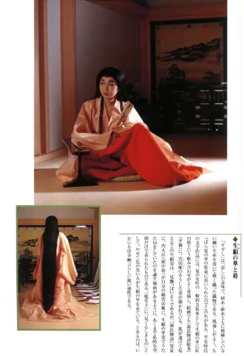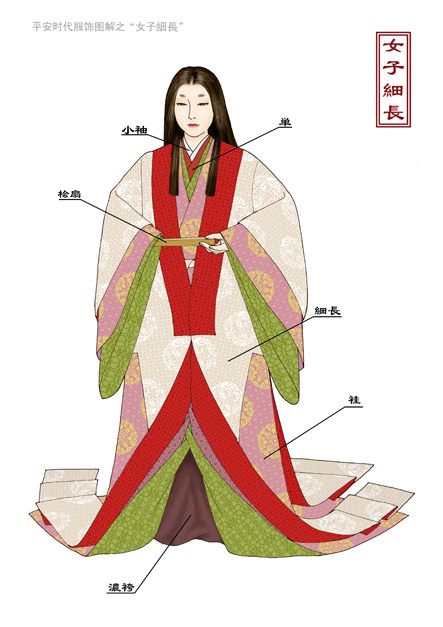 所謂“細長”,是一種替代“唐衣”和“裳”,並且兼備“唐衣”和“裳”作用的,穿在圭上,看上去細長的服裝。從外至內的穿著順序為“細長”、“袿”、“單”“長袴”,腰的部分由“當帶”束住,手上持“檜扇”。“細長”的質地和花紋並沒有特別的規定。