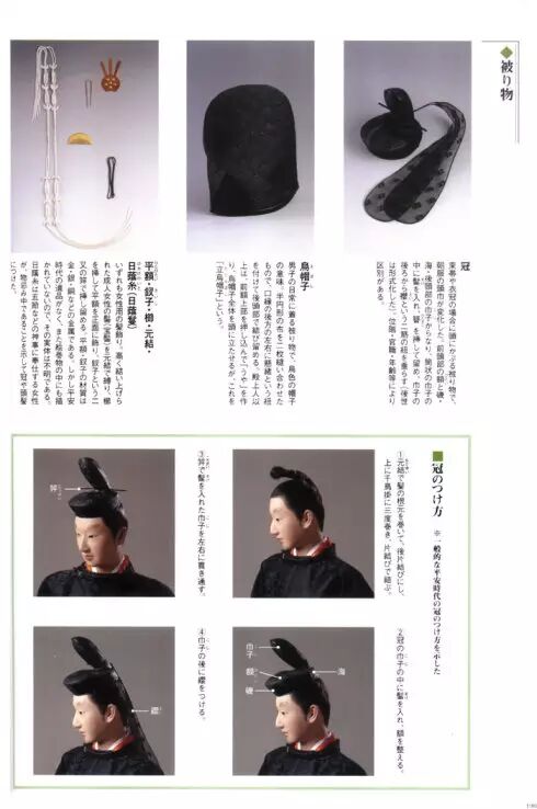 “衣冠”是相對於“束帶”的簡略式樣的公家(朝臣)服裝。和“束帶裝束”的“晝裝束”名稱有一個相對應的名字:“宿裝束”。“衣冠”原本是夜晚值班的時候所穿著的,後來作為平常入宮覲見的時候所穿著的服裝。“衣冠”和“束帶”很大的不同在於,“衣冠”省略了“下襲”部分,並且省略了“表袴”,以“指貫” (穿上後雙腿褲管類似燈籠的褲子)代之;“石帶”也為“腰帶”所替代。不過,“衣冠裝束”倒似乎沒有文武官之別的規定。(圖示為五位殿上人冬季的“衣冠裝束”)這裡再附帶介紹一下“殿上人”:所謂“殿上人”,就是指官階在六位以上、並且被允許上殿的官員;三位以下六位以上的殿上人被稱為“大夫”,而三位以上的“殿上人”,就被稱為“公卿”。