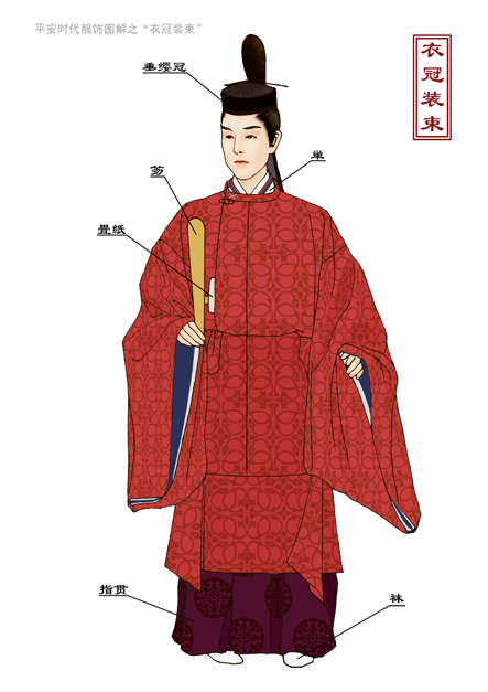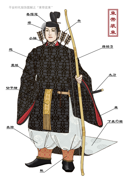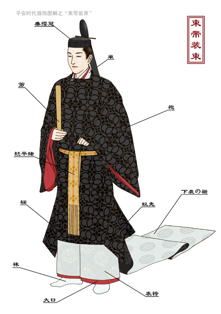 所謂“束帶裝束”,就是指在朝廷的公事和儀式時以及上朝覲見的時候所穿著的裝束。“束帶裝束”一開始只是用於祭祀儀式上,後來朝廷中有權勢的公卿卻在上朝的時候仍然堅持要穿著, 後來逐漸發展成為朝服了。“束帶裝束”大致為:頭戴“冠”(而冠也因文、武官而異;文官戴“垂纓冠”,武官戴“卷纓冠”,並在臉頰兩側戴有耳飾品)著“袍”(所謂“袍”,就是指上衣部分,“袍”的顏色根據職位的高低有不同的規定,大致為:“帝”穿的“袍”顏色為“黃櫨染”和“麴塵”官居一位者,著“深紫色袍”;四位以上為“黑袍”,五位“蘇芳袍”,六位“縹袍”),“半臂”(一種無袖衣服) 、“下襲”、“單”,“小袖”(內衣),並且腰間配“魚袋” (入宮憑證,公卿為金魚袋,殿上人為銀魚袋)和“太刀”(單韌為刀,雙韌為劍);文官手持“笏”(古代官員上朝的時候手裡拿的狹長的板子,用玉,象牙或者竹製作而成;和中國古代的“笏”用來做上朝時候的政事記錄作用不同,日本的“笏”不是用來記錄政事的,而是為了體現威儀而存在的裝飾品)武官手持長弓,背“矢”(古代對“箭”的稱呼)腰間束被稱為“石帶”的腰帶(帶子的部分附有玉或石頭的裝飾品),穿“表袴”(一種穿在最外面的褲子,一般表為白,里為赤),“大口”(穿在“表袴”下面的褲子,因為一般為紅色,所以也叫“赤大口”)“下襲”(“下襲”的顏色按照季節有所不同,冬天為“躑躅”、“桜”、 “搔練”“蘇芳”;夏天為“二藍”以及“白”)“長裾” 拖地(“裾”部分拖在地上的長度從最短的50厘米到最長的可達5米;“束帶“的樣子可以參照野村萬齋主演的電影版本《陰陽師Ⅰ》裡晴明殺蝶那段裡朝臣們穿的服裝樣式)足上穿“襪”(現在的日本人穿和服時套在腳上的“足袋”是分開大腳趾和其他腳趾的,而“襪”不分腳趾,並且一般為白色布料製作而成),並且穿“沓”(一種鞋子,一般為皮革和木頭製作而成)的裝束。