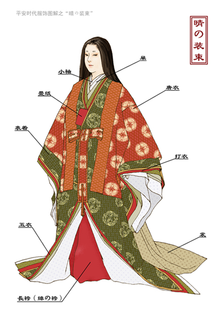 “女官晴之裝束俗稱十二單,女官正裝,和男子的束帶一起作為宮中的正裝。頭髮是垂發,用叫做釵子的簪子束起來。上身最外面穿的是唐衣,唐衣很短。下身的後方拖在地上的白色的布料叫做裳,前面是沒有裳的,裳是系在腰的後方的。往裡面的衣服順序為表著, 袿。 袿一般是三到五件地重疊穿在身上,因此叫做五衣,但是二十多件袿重疊穿在身上的例子也是有的。裳的里面下半身穿長袴。胸口夾貼紙。 如今也作為宮中女子正裝被使用。”
