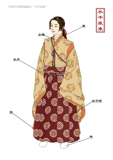 “水幹”,是從“狩衣”演變出來的,是狩衣的簡略化裝束。原本是武家的便服,但是後來公家也穿, “水幹” 後來就發展成下等官員或者貴族尚未施元服之禮的男童所穿的便服,同時也作為一般庶民的日常裝。是領口用長線系結的斜門襟短上衣裝束。“水幹”有一個很容易辨別的特徵就是在門襟的位置是使用繩帶系結來達到固定的目的的。“水幹”的穿法有兩種,一種和狩衣一樣是結住“首上”,也就是領口處,還有一種就是把門襟向內折疊,形成一個“V”字型的領口;兩種穿法都是把上裝塞到“水幹袴”裡面,然後束緊腰。水幹也有公家和武家之分。公家男童穿的水乾結是左右對稱系在前胸處的,而武家男童的水乾結是講繩帶從右肩向左肋方向繞至前胸再打結,並且要把後裾塞入水幹褲裡。穿著水幹裝束的公家和武家的男童模樣十分惹人喜愛。