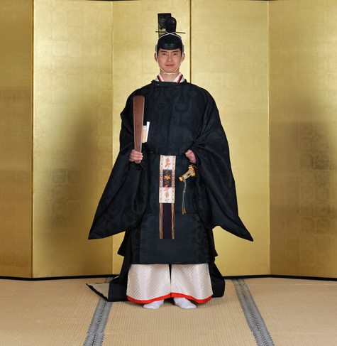 “天皇的便裝是直衣姿。在家裡的時候的貴族男性,穿著叫做直衣的服裝,直衣同時也是天皇和皇太子的便裝。這個和被叫做束帶的正裝的一樣有上衣,但是顏色和紋樣卻沒有特別的規定。這種上身穿著上衣,下身穿著叫做指貫的褲子一樣的服裝便是直衣姿。和皇室有親戚關係的人,特別是得到特殊的赦免,或者說是得到特殊允許的貴族,也是可以穿著直衣服姿進宮的。並且,直衣姿中戴冠的為正式的,即使在房間裡,據說也不太會把冠摘下來。”