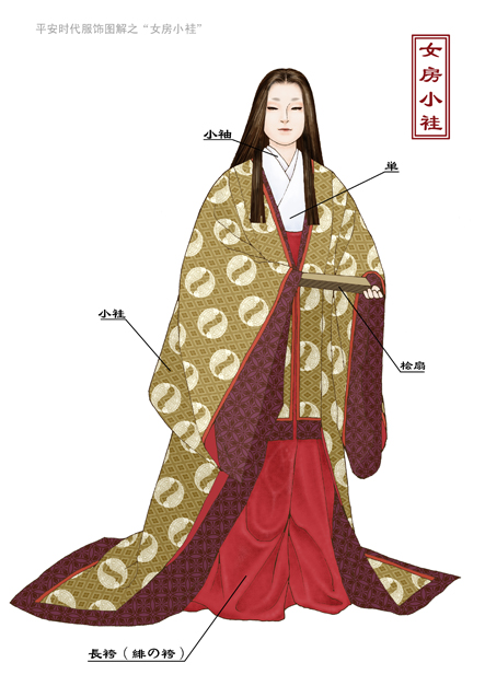 “女房褻裝束”有許多種類,大致介紹一下比較常見的幾種:“小袿”、“細長”。“小袿”,作為“晴裝束”的簡略式禮服存在。是使用“小圭”代替了“唐衣”和“裳”,“小袿”比“表著”稍稍短一些。“小袿”的層次分佈大致是:在最外面著“袿”,裡面著“單”(多為白色)以及白色“小袖”(內衣,穿在“單”的里面),下著“長袴” 。天冷時也有穿數層袿的情況。