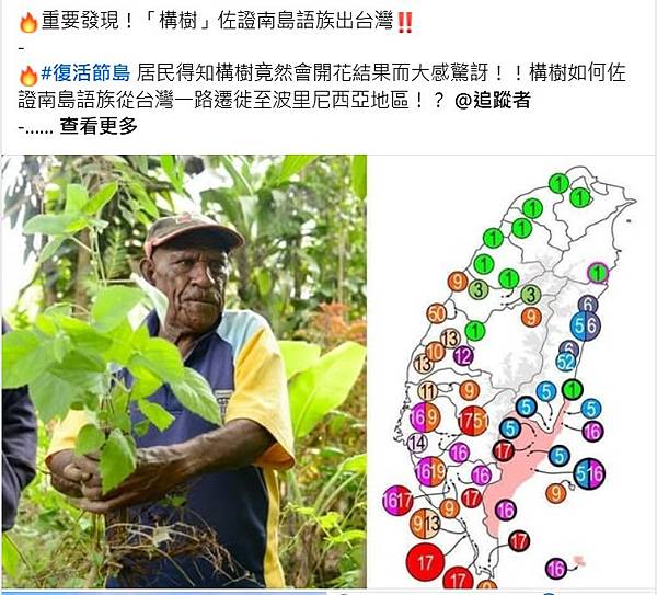 〔記者吳柏軒/台北報導〕台灣是南島語族原鄉再度找到一有力支持!台灣大學森林環資系與智利共組團隊,分析西太平洋島弧的超過六百個構樹樣本,證實台灣是「太平洋構樹」的「原鄉」,更因太平洋構樹必須經由人類移植,這六百個構樹樣本會在各地出現,就成為南島語系的祖先是從台灣跨出,移動到世界各地的佐證。