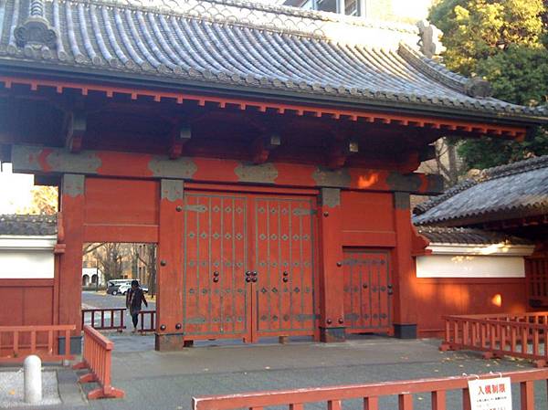「赤門」 原為加賀藩的御守殿門,依古代日本習俗,御守殿門受災損毀不能重建,而已有百年以上的歷史東京大學赤門是歷經戰亂後唯一留存下來的御守殿門,因此被日本政府列為國寶,現則指定為重要文化財。