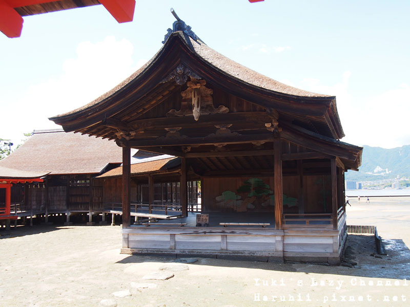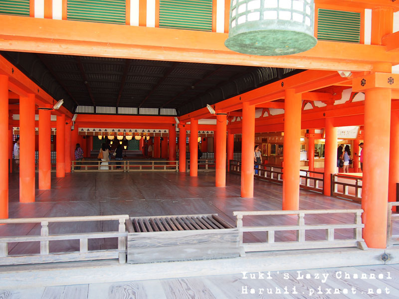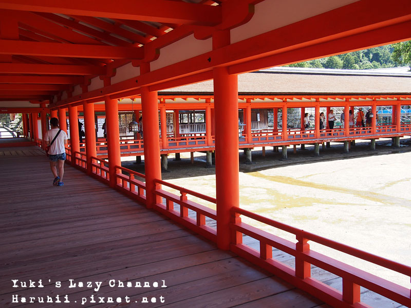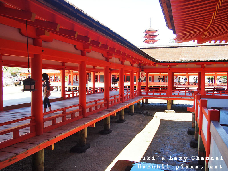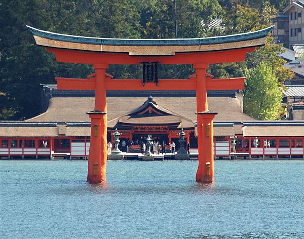 由於神社殿堂建在海上,因此必須修建長廊作為連接陸地的通道。退潮時,遠在神殿150m外的大鳥居周圍也會完全露出海面,而滿潮時,海水則會漫至神殿的長廊之下。滿潮時走過長廊,你會發現經水面反射的陽光映照在朱紅色的樑柱表面,泛出粼粼波光,令人彷彿置身於海底宮殿一般,也就難怪平安時期的貴族們將嚴島神社稱作「龍宮」了。