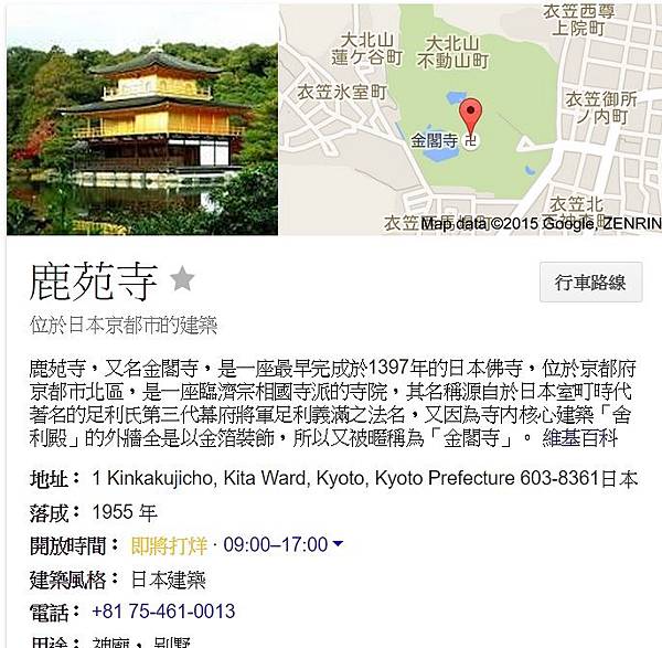 鹿苑寺,又名金閣寺,是一座最早完成於1397年(應永四年)的日本佛寺,位於京都府京都市北區,是一座臨濟宗相國寺派的寺院,其名稱源自於日本室町時代著名的足利氏第三代幕府將軍足利義滿之法名,又因為寺內核心建築「舍利殿」的外牆全是以金箔裝飾,所以又被暱稱為「金閣寺」。