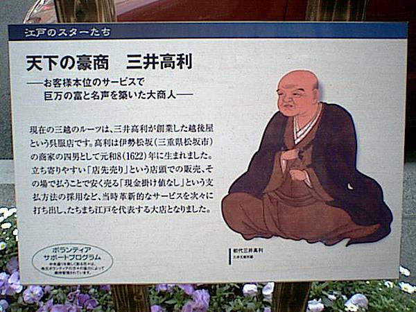 建立三井財閥基礎的為三井高俊的四子三井八郎兵衛高利(1622-1694),他在延寶元(1673)年離開故鄉松坂,在京都開設“吳服店”;同年亦在江戶(今東京)開設同樣的商店,店名與其父的店名一樣叫做“越後屋”,京都店負責採購,江戶店負責販賣。這就是世界上第一家百貨商店——“三越百貨公司”的起源。