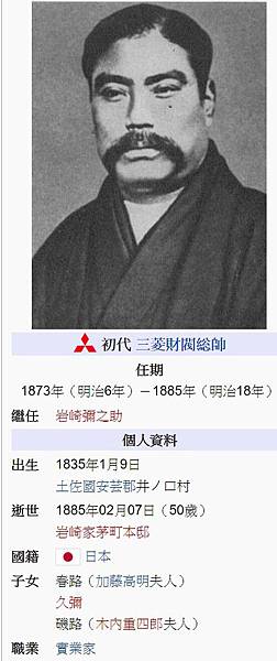 岩崎彌太郎いわさきやたろう天保5年12月11日~明治18年2月7日(1835~1885)日本“第一財閥”三菱集團創始人,1834年12月11日出生於土佐國(現高知縣)安藝郡井口村的一個“地下浪人”的家庭。彌太郎幼時生活在下層社會,1864年才當上了下級官員,後來經營官方的“土佐商會”,成績卓著。
