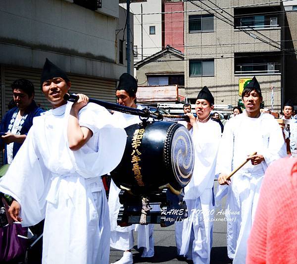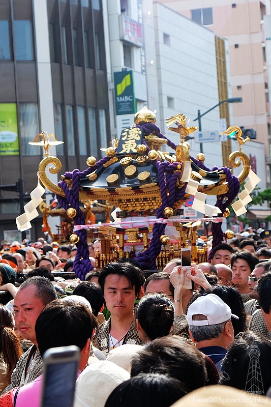 除了神轎之外還不能錯過的,是星期五13:00開始的巡遊。載著吹笛人和打鼓人的花車,以及打扮成傳統手藝人的歌者、舞者等,從柳街一直巡遊到神社。