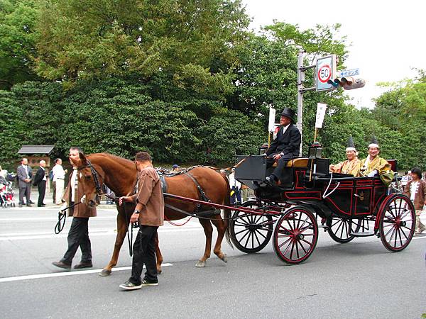 在隊伍的最前面是京都市長,搭著明治維新時代的馬車出場