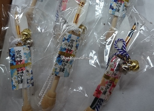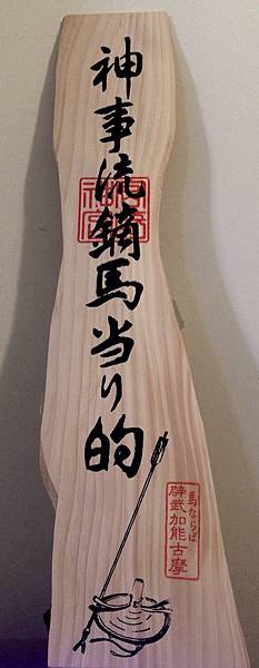 『那是流鏑馬(Yabusame)時,讓各表演者所射下的木靶。演出後神官會分別在其上唸咒寫上今日神事,再販售給觀賞者。只是由於數量不多,通常1-2分鐘內會出售完畢。就習俗而言,演示給諸神的流鏑馬神事中所使用的木靶,經射下後帶有消災解厄之力。』