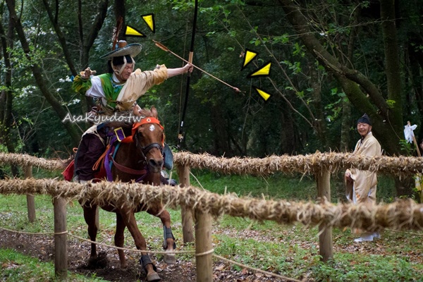 每年春天的活動現場,觀眾可欣賞箭法純熟的高手身穿傳統日本服飾,騎馬奔馳同時拉弓瞄準三個標靶,展現絕佳箭術!