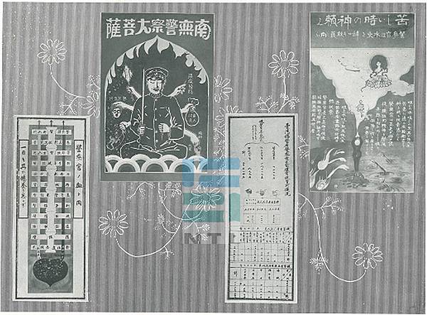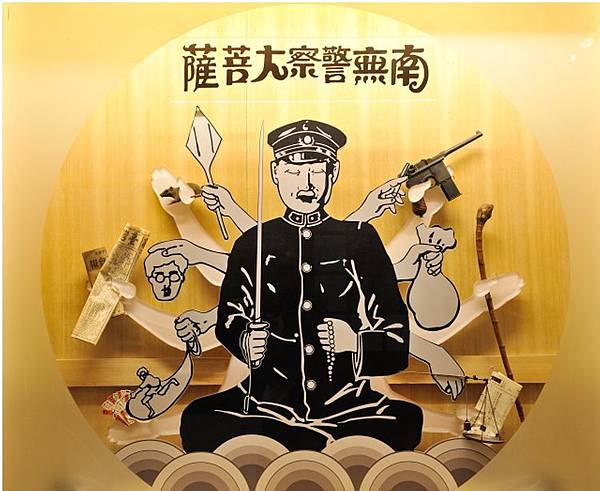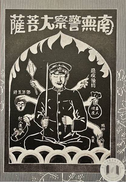 此為1926年(大正15年)臺北州警察衛生展覽會所展出的海報,將警察化身為千手觀音菩薩,一手拿刀一手拿佛珠,代表糖與鞭子,無事不管,從衛生取締,思想取締,原住民授產,逮捕犯人,救助。有研究者曾說臺灣當時可說是警察之島