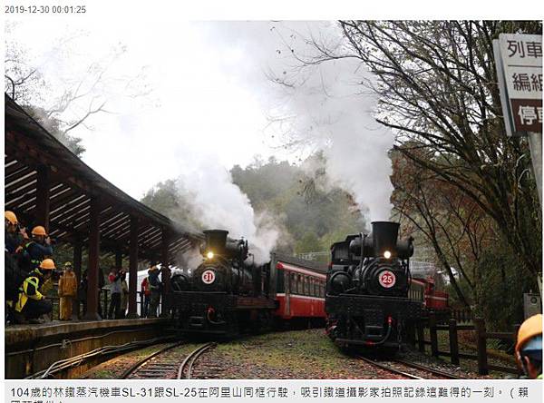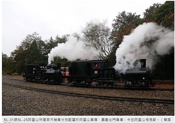 阿里山林鐵及文資處副處長周恆凱表示,25號、31號蒸汽機車都1915年製造、迄今已104歲,其中25號配屬於嘉義北門車庫,31號蒸汽機車配屬於阿里山車庫,一台行駛平地、一台行駛山區,難得同框,因此與「鐵道情報」雜誌合辦攝影活動,包括日本鐵道攝影家神谷武志、鹽塚陽介,還有國內紀錄片導演黃威勝、資深鐵道研究者許乃懿、鐵道攝影家陳映彤等人都與會。2台百歲林鐵蒸汽機車阿里山同框 80攝影師見證感動一刻 - 生活 - 自由時報電子報 http://bit.ly/2Qw8DCH