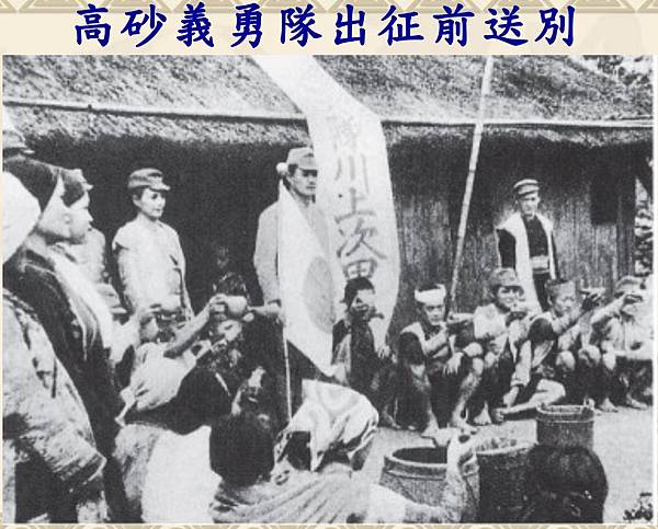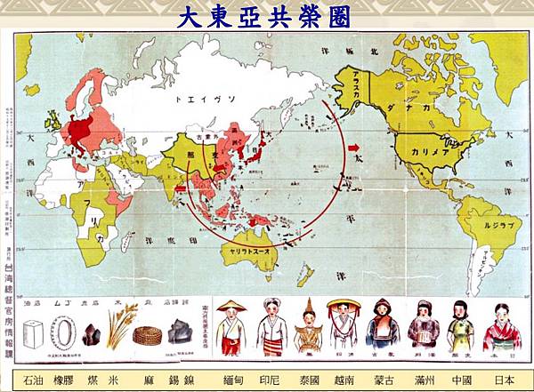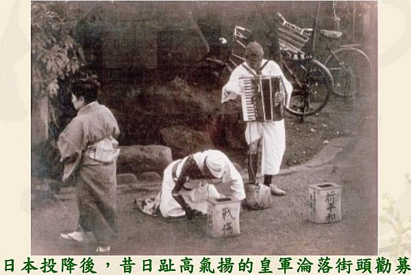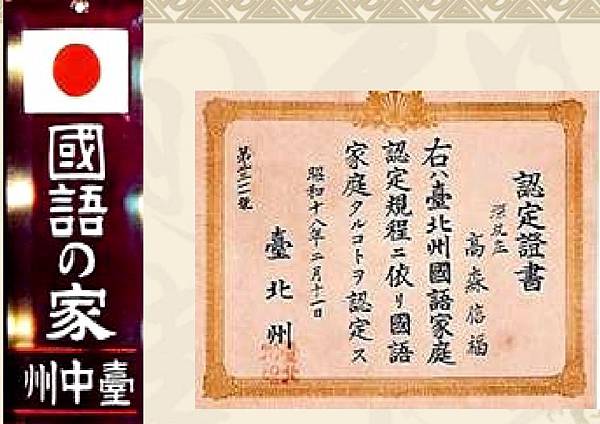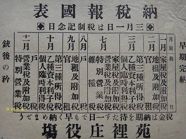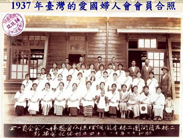 台北州日本政府官員於神社前之合影,右方則立有「納稅報國」的旗幟。