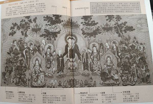 他身後的佛光照亮了天地萬物,作者巧妙地運用放射性的波紋線條來表現背景,正好與佛光的發射性結合起來。運用這種表現手法正是作者的高明之處,這些線條穿過樹木,透過騰騰的雲氣,一直延展下去,也許正在向世人暗示佛法的無邊。周圍人物各居兩邊,有的為側面,有的為正面;有的呈坐姿,有的呈立姿;有的寬袍長衣,佛帶飄逸,有的袒胸露腹,盔甲滿身;有的面容俊逸,溫和慈善,有的瞠目立眉,叱吒猙獰。表現手法真是多種多樣,但無論怎樣變化,他們都是聚集在佛祖身邊,手拿法器,各居其位,時刻待命。觀此景像也許你會感受到一種無窮的力量在感召著你,那普照的佛光會一直射進你的心中,與你的心靈產生一種完美的契合。