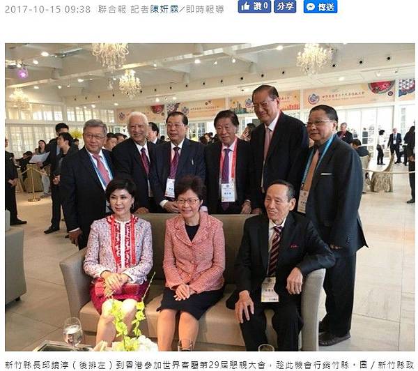 新竹縣長邱鏡淳(後排左)到香港參加世界客屬第29屆懇親大會,趁此機會行銷竹縣。圖...