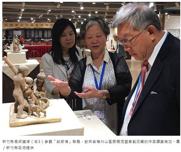 新竹縣長邱鏡淳(右3)參觀「故鄉情」聯展,對來自梅州山區民間泥塑家劉沅聲的作品讚...