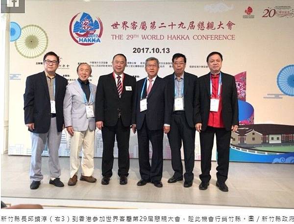 新竹縣長邱鏡淳(右3)到香港參加世界客屬第29屆懇親大會,趁此機會行銷竹縣。圖/...