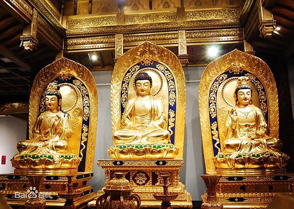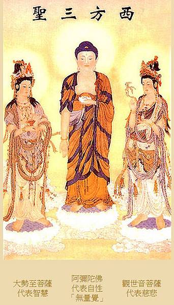 西方三聖又稱阿彌陀三尊,中間是阿彌陀佛,左邊觀世音菩薩,右邊大勢至菩薩組成(此處的左和右是按照阿彌陀佛的左手邊和右手邊)淨土宗崇拜對象。阿彌陀佛是表無量光明,無量的壽命,無量的功德。觀音菩薩是表大慈悲,宇宙的大慈悲。大勢至菩薩是代表喜捨[1] 。
