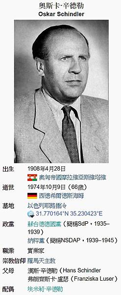 奧斯卡·辛德勒(Oskar Schindler),(1908年4月28日-1974年10月9日),德國商人,利用德國戰爭時期,誘逼猶太人投資,再僱傭廉價的猶太人做工,在這讓充滿了殺戮與硝煙的年代大賺了一筆錢,同時保護了上千名猶太人的生命,占波蘭全部存活猶太人數量的一半左右。但當他重新思考人類存在的意義,而不僅僅是個人的財富之後,他開始用戰爭期間賺來的金錢買下一個個必遭集中營厄運的猶太人:卓斯納、維恩、羅斯納、費佛堡、費雪、夏法、伍蘭克、霍洛維茲 ......最後,倖存的猶太人用自己保存下的一顆金牙,也是他們戰後僅存的唯一的財富所有,為辛德勒鑄成了一枚戒指,並在上面刻了一句猶太法典上的希伯萊經文:“Whoever saves one life,saves the world entire.(救一條命等於救全世界)。”辛德勒哽咽地說:“我花掉了太多錢……我本可以……這輛車——十條命……這枚胸章——兩條命……”