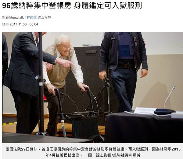 德國法院29日裁決,高齡96歲、「奧斯威辛帳房」的前納粹黨衛隊獄吏格勒寧(Oskar Groening),經鑑定身體健康可入獄服刑。儘管已經終戰逾70年,其他曾為納粹效力的高齡戰犯,一樣可能面臨起訴坐牢命運。