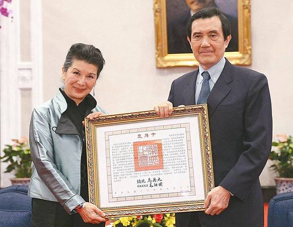 馬總統(圖右)昨天頒發褒揚令給已故前大使何鳳山,由何的女兒何曼禮(圖左)代表接受。 中央社