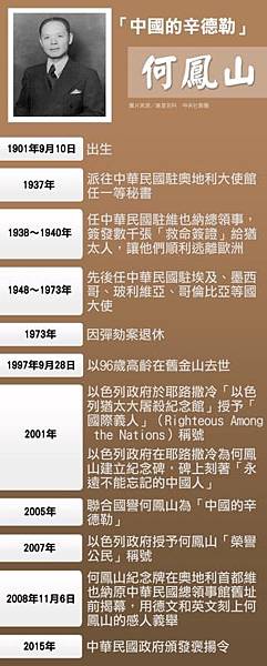 外交部故大使何鳳山曾在二戰時間救無數猶太人逃離納粹被譽為「中國辛德勒」,他女兒何曼禮10日表示,總統馬英九頒贈褒揚令,希望這個是國家最終還父親公道的一大步。圖為何鳳山大事記。中央社製表 104年9月10日