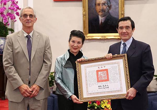 馬英九總統上午頒發褒揚令給已故大使何鳳山,表彰他過去在二戰期間,義助歐洲猶太人,馬總統向何鳳山的女兒何曼禮兩度表達歉意。 照片/總統府提供