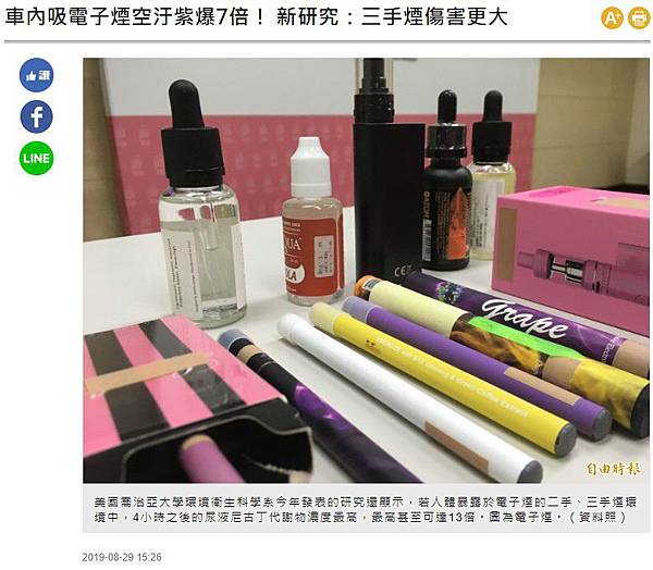 車內電子煙、加熱煙車內二手煙暴露量的研究,結果顯示電子煙在車內產生的PM2.5最高可達到490微克/立方公尺,是台灣政府明定大氣空污「紫爆」的7倍之多。若人體暴露於電子煙的二手、三手煙環境中,4小時之後的尿液尼古丁代謝物濃度最高,最高甚至可達13倍-室內空污的主要污染源就是二手菸,而新興煙品的二手煙產生的PM粒徑,不少都比PM2.5還要小,目前已知持續暴露在高濃度的PM2.5會提高致癌的風險-大氣PM2.5濃度達71微克/立方公尺就為高危害的「紫爆」點,各級學校的戶外體育活動需暫停,同理,面對新興煙品的室內二手煙危害,需要政府修法明確制止 https://is.gd/fKrxNI