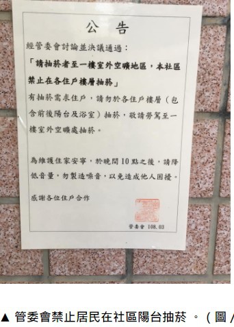 ▲ 管委會禁止居民在社區陽台抽菸 。(圖/翻攝自爆廢公社)