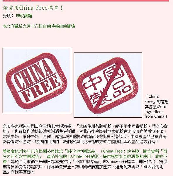 China-Free 會否像當年的 Intel Inside 標籤,成為某種業界行銷方式,沒有人敢說,但可以肯定的是,愈領教過中國產品厲害的國家,愈不希望這個劣質產品輸出大國和平地堀起;因此,China-Free 的聲浪愈大,Free China 這句話在國際舞台愈難取得迴響,愈沒有力量,愈空洞無物。