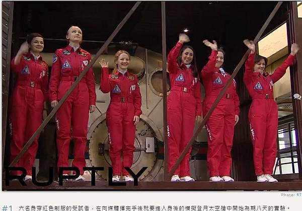 六名身穿紅色制服的受試者,在向媒體揮完手後就要進入身後的模擬登月太空艙中開始為期八天的實驗。