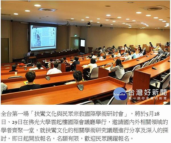 全台第一場「扶鸞文化與民眾宗教國際學術研討會」,將於5月28日、29日在佛光大學雲起樓國際會議廳舉行,邀請國內外相關領域的學者齊聚一堂,就扶鸞文化的相關學術研究議題進行分享及深入的探討,即日起開放報名,名額有限,歡迎民眾踴躍報名。