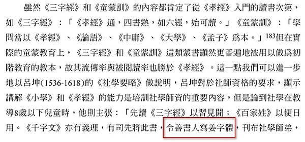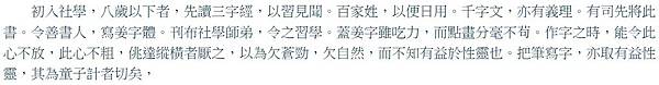 每天,當學生倦怠懶散時,則歌詩一章。選擇古今一些特別淺顯、貼切、流利暢快、讓人感奮激發、與日常生活關係密切的詩,集合成一本書,讓他們吟詠,給他們講解,要求他們體會。古詩如《陟岵》、《蓼莪》、《凱風》,(這是關於父母方面的。)《棠棣》、《小明》、《杕杜》,(這是關於兄弟方面的。)《江漢》、《出東門》,(這是關於男女之情的。)《雞鳴》、《雄雉》,(這是關於夫婦之道的。)《燕燕》,(這是關於正妻與妾方面的。)《伐木》,(這是關於朋友方面的。)《芄蘭》,(這是關於孩子方面的。)《葛藟》,(這是關於百姓貧窮的。)《相鼠》 ,(這是教導學禮的。)《伐檀》,(這是訓勉道義的。)《採苓》、《青蠅》,(這是告誡不要聽信讒言的。)《蟋蟀》、《瓠葉》,(這是示現節儉的。)《采蘋》,(這是有關重視祭祀的。)《白駒》,(這是仰慕賢人的。) 自漢魏以來的樂府古詩,或是近代教導百姓的方言土語,只要是與綱常倫理、道義身心相契合的,每天講授一章。對於那些新聲艷語,只要得知有學生學習的,一定重重責罰。(《訓蒙教約》之後,附錄輯集了部分詩歌,就是這個意思。) 初入社學,八歲以下者,先讀三字經,以習見聞。百家姓,以便日用。千字文,亦有義理。有司①先將此書。令善書人,寫姜字體。刊布社學師弟,令之習學。蓋姜字雖吃力,而點畫分毫不茍。作字之時,能令此心不放,此心不粗,佻達②縱橫③者厭之,以為欠蒼勁,欠自然,而不知有益於性靈也。(把筆寫字,亦取有益性靈,其為童子計者切矣。)【註釋】 ①有司:官吏。古代設官分職,各有專司,故稱。 ②佻達:輕薄放蕩;輕浮。 ③縱橫:亦作“縱衡”,肆意橫行,無所顧忌。【譯文】 剛進社學學習,八歲以下的學生,先讀《三字經》,以學習見聞,讀《百家姓》,以便日常應用,讀《千字文》,這中間也包含了一些倫常道德的內容。官吏先將這些文章讓善於書 法的人用姜字體書寫,刻版印行給各社學的老師和學生,讓他們學習。姜字雖然寫起來吃力,但是字一筆一畫絲毫不苟,寫字時能使心不散漫,不粗心浮氣,那些心浮氣躁及無所顧忌的人討厭寫姜字體,認為這種字體不夠蒼勁和自然,卻不知其於性靈有益。(執筆寫字也要選擇有益性靈的,這是真正在為孩子考慮啊。) 教童子,先學爽潔。硯無積垢,筆無宿墨①。蘸墨只著水皮,幹筆先要水潤。書須離身三寸,休令拳揉。手須日洗兩番,休污書籍。案上書,休亂堆斜放。書中句,休亂點胡批。學堂日日掃除,桌凳時時擦抹。【註釋】 ①宿墨:積留在硯台上的陳墨。【譯文】 教育孩子時,先教孩子學習清爽整潔。硯台上沒有積垢,毛筆上沒有陳墨。蘸墨時只接觸墨的表面,幹筆要先用水浸潤。書離身體必須有三寸之遠,不要捲曲和來回地搓。手每天要洗兩遍,不要弄髒了書籍。書桌上的書不要亂堆斜放,書中的句子不要亂點胡批。教室每天都要打掃,桌椅要經常擦抹。 唸書初要數字,(即認字之法,)次要聯句。次要一句緊一句。眼定,則字不差。心不走,則書易入。句漸緊,則書易熟。遍數多,則久不忘。詳見分年日程。 看書不可就講。先令童子將注貼經①,貼過一番,令之回講,然後一一細說。巧比再看,復回不知,再講,庶幾有得。 作文,出極明淺,易於發揮題目。作不得題,細講一遍,仍作此題。一題三作,其思必盡,其理自通,勝於日易一題也。(十分深奧不能作之題,則且緩出。)【註釋】 ①貼經:科舉時代考試的一種方式,主要是死背詞句。【譯文】 讀書時首先要指著字念(就是認字的方法),將前後句連成來讀,再次是要一句緊跟一句。眼定,字就不會讀錯;心定,書就容易契入;語句逐漸跟緊,書的內容就容易熟悉;讀的遍數多,則長時間都不容易忘記。(詳見“分年日程”。) 看書不可就講,先讓學生將註解背熟,背熟之後,讓他們自己先將經文從頭至尾講解一遍,然後老師再一一細說。學生比較自己講的和老師講的之後,再次復講,如果還是不懂,老師再講解一遍,這樣學生或許有所收穫。 學生練習寫作,老師給他們出一些非常淺顯明白、容易發揮的題目。文章若不切題,老師仔細講解一遍,仍然作原來的題目。同一個題目練習三次,學生對問題的思考必定已十分深入,義理自然較為通達,這樣做勝過每天練習不同的題目。(十分深奧不能練習寫作的題目,暫且不要急著出。) 記文,須選前輩老程文①,極簡,極淺,極切,極清者,每體讀兩篇。作文之日,模做讀過文法②者出題,庶易引觸。讀書以勤為先。童子不分遠近,俱令平明③到學。背書完,讀新書。吃飯後,略令出門鬆散一二刻,然後看書作文。寫仿畢,仍讀書。午飯後,再令出門鬆散一二刻,仍讀書。日落後,分班對立。出對一個,破題④一個,即與講改,然後放學。蓋少年脾弱,飯後不可遽用心力,恐食不消化也。【註釋】 ①程文:科舉考試時,由官方撰定或錄用考中者所作,以為範例的文章。明代以後特指試官擬作者。 ②文法:文章的作法。 ③平明:猶黎明,天剛亮的時候。 ④破題:舊時試帖詩及八股文形狀用一兩句話說破題目的要旨。【譯文】 背誦文章,必須選擇進士及第者用作範例並且結構非常簡潔、文辭非常淺顯、內容非常貼切、文字非常清新的文章,每種文體熟讀兩篇。練習寫作的那天,模仿曾經熟讀過的文章的作法出題,這樣做一般容易觸發學生的思路。讀書首重勤奮。學生不分遠近,都要求黎明即到學堂。學生背完書之後,讀新的內容。吃過早