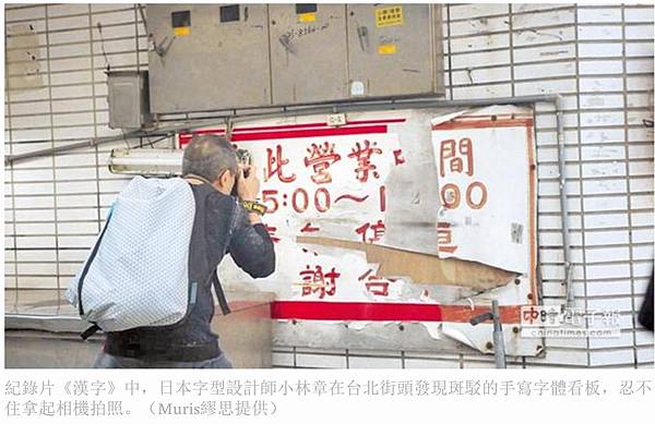 「台灣的手寫招牌有些楷書和隸書混用,很有趣!」台灣街道上琳瑯滿目的書法體招牌,讓日本字型設計師小林章也忍不住驚豔,拿著相機猛拍。紀錄片《漢字》採訪台、港、日、美、英多位設計師,探尋漢字之美,今年獲城市遊牧影展首獎,並受邀於新加坡設計影展放映,預計最快於明年初上映。