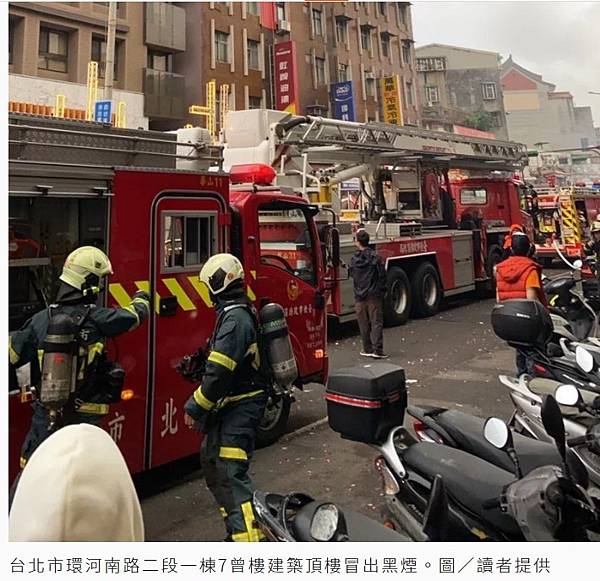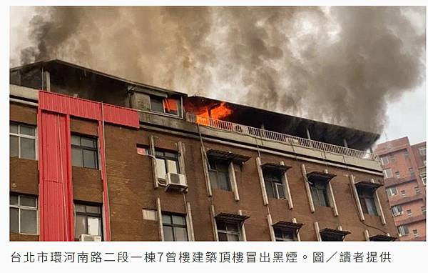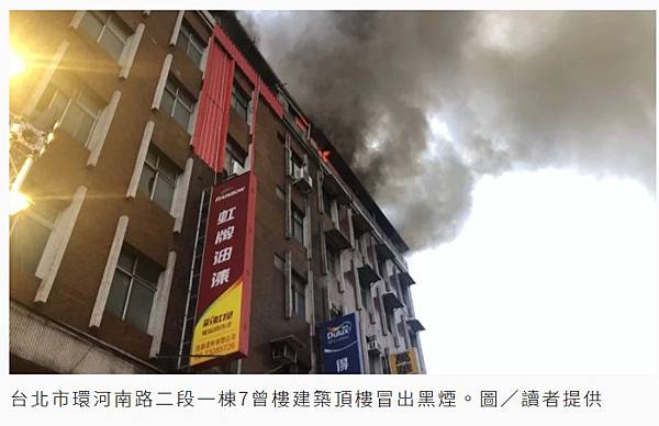 台北市環河南路二段一棟7曾樓建築頂樓冒出黑煙。圖/讀者提供