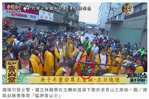 今年值東爐主林麗華見狀立刻到青山王主轎前,邊哭邊求青山王保佑、原諒,並要求現場眾人「鞭炮別再放了!」