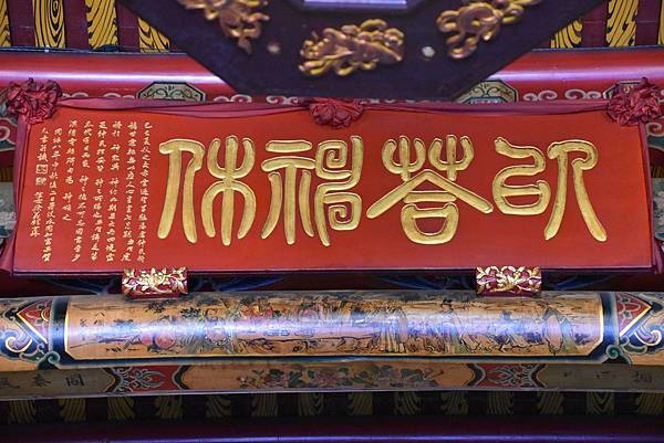 為感謝青山王的恩賜,富大人臨摹李陽冰〈縉雲縣城隍廟碑〉內文篆書(鐵線篆),敬獻「以荅神休」匾額一方,並在下款敘及贈匾緣由,成為一段佳話。荅字通答,「以荅神休」的意思是藉頌匾以感謝神明賜予的福祥。