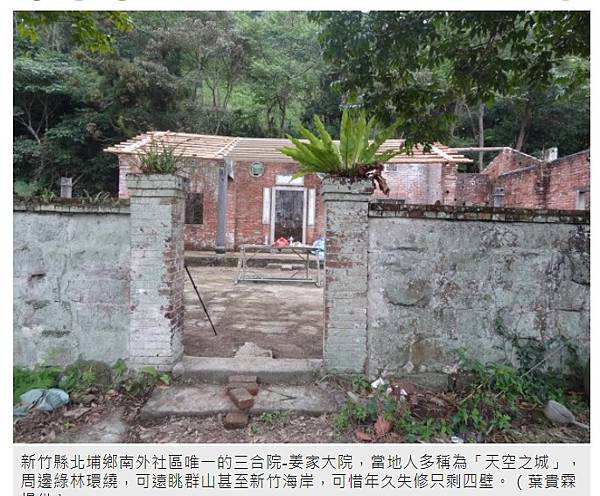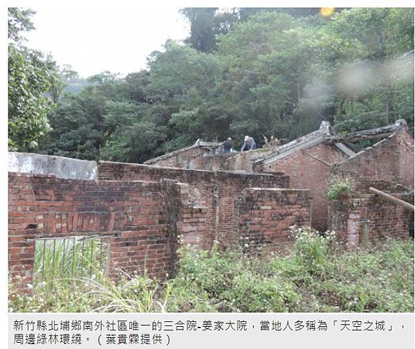 新竹縣北埔鄉南外社區唯一的三合院-姜家大院,當地人多稱為「天空之城」,周邊綠林環繞,可遠眺群山甚至新竹海岸,可惜年久失修只剩四壁。(葉貴霖提供)