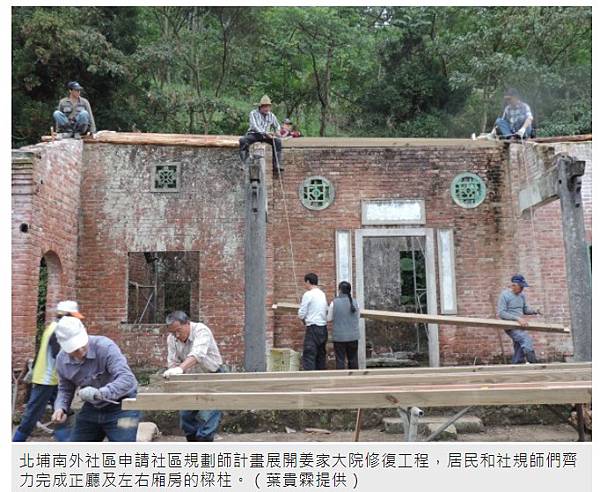 北埔南外社區申請社區規劃師計畫展開姜家大院修復工程,居民和社規師們齊力完成正廳及左右廂房的樑柱。(葉貴霖提供)