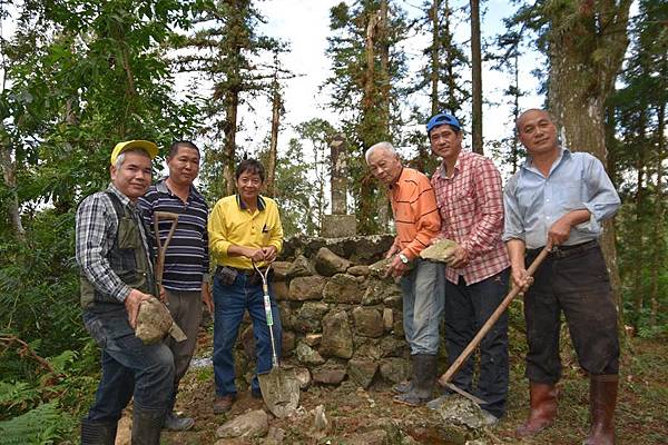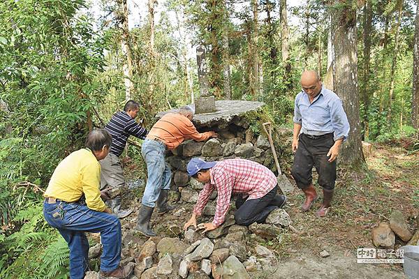 昨天號召南坑村、外坪村及大林村姜禮臣、徐焜明、劉進烜等村民,經過堪輿師指示,赴五指碑修復,連年長者也背負數公斤重的水、水泥,走1小段山路,只為復原五指碑,材料費用則由居民彭沐本、彭春妹贊助,地主也提供午餐,集眾人之力修復。