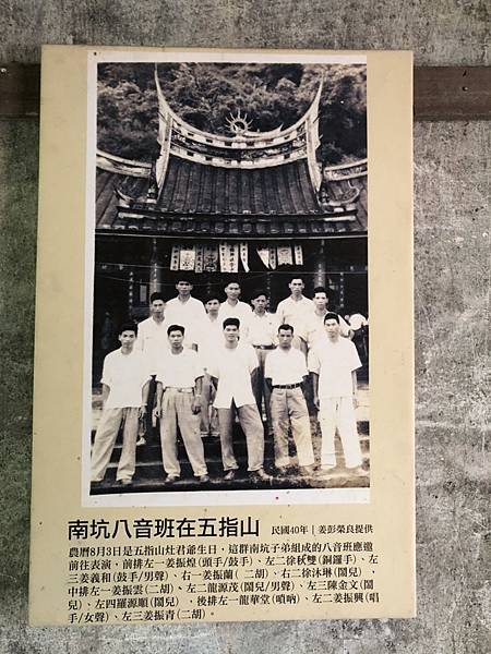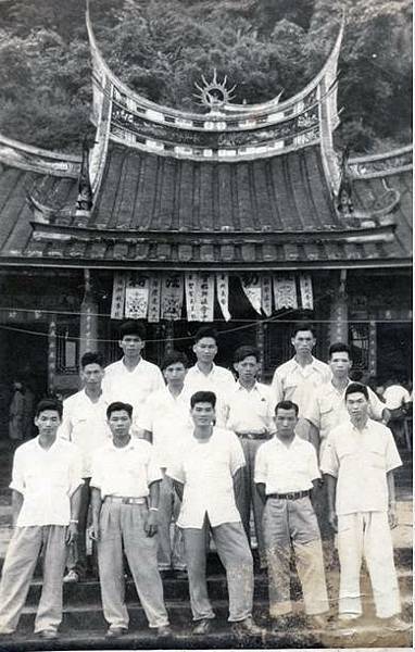 老照片:攝於民國40年,這群在姜家大院學習八音有成的年青子弟,在該年八月初前往五指山灶君堂演出八音,留下這張經典照片。