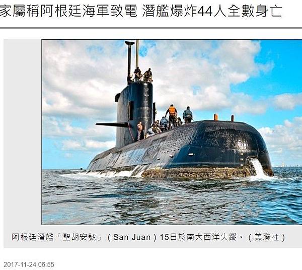 〔即時新聞/綜合報導〕阿根廷潛艦「聖胡安號」(San Juan)15日於南大西洋失蹤至今,有船員家屬指出,有海軍官員跟他說,他的兒子已經罹難,潛艦上全員身亡。