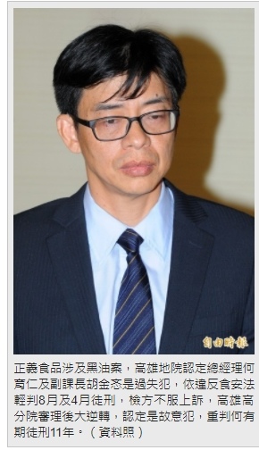 〔記者鮑建信/高雄報導〕正義食品涉及黑油案,高雄地院認定總經理何育仁及副課長胡金忞是過失犯,依違反食安法輕判8月及4月徒刑,檢方不服上訴,高雄高分院審理後大逆轉,認定是故意犯,重判何有期徒刑11年,3年徒刑可易科罰金﹔胡則處徒刑5年6個月,1年6月徒刑部分可易科罰金,並沒收正義8億元犯罪所得。
