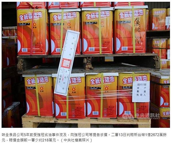 味全食品公司5年前受強冠劣油事件波及,向強冠公司等提告求償。二審13日判賠新台幣1億2672萬餘元,賠償金額較一審少約218萬元。(中央社檔案照片)