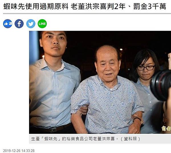 〔記者黃良傑/高雄報導〕知名食品「蝦味先」製造商老字號廠商裕榮食品,被控使用逾期原料製成多種口味蝦味先,也涉使用逾期紅麴粉生產旗下生技公司代工的「發芽大豆養生粉」,違法時間長達約2年多,估計有250萬包問題產品,高雄地院今宣判,判決裕榮老董洪宗喜2年有期徒刑、蘇姓廠長、謝姓經理各判2年10月、2年6月,罰款3千萬,全案仍可上訴。