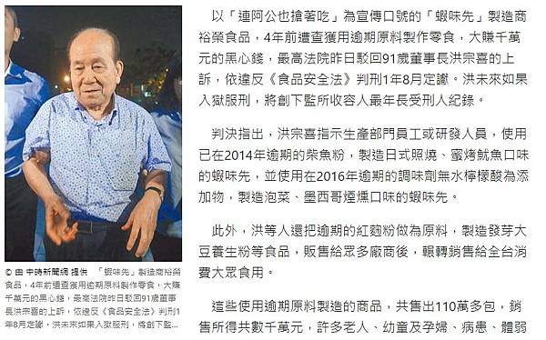 以「連阿公也搶著吃」為宣傳口號的「蝦味先」製造商裕榮食品,4年前遭查獲用逾期原料製作零食,大賺千萬元的黑心錢,最高法院昨日駁回91歲董事長洪宗喜的上訴,依違反《食品安全法》判刑1年8月定讞。洪未來如果入獄服刑,將創下監所收容人最年長受刑人紀錄。