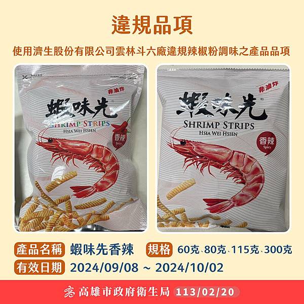 高雄市衛生局隨即派員前往裕榮食品股份有限公司,經查雲林縣濟生公司斗六廠流向高市裕榮食品股份有限公司不合格原料共8公斤,作為調味用,已於今年1月至2月初製成「蝦味先香辣口味」(規格60/80/115/300克,批號有效期限2024.9.8至2024.10.2)產品共31208.65公斤,現場已無該批不合格原料。